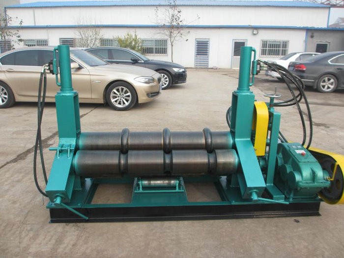 該機(jī)結(jié)構(gòu)形式為三輥非對(duì)稱式。側(cè)輥在兩直列輥中間對(duì)稱位置作平衡升降運(yùn)動(dòng),通過(guò)絲杠、絲母而獲得,兩直列輥?zhàn)餍D(zhuǎn)夾緊送料運(yùn)動(dòng),通過(guò)減速機(jī)的輸出齒輪與下輥齒輪嚙合,實(shí)現(xiàn)板材的行走。當(dāng)側(cè)輥輥的下壓力超過(guò)材料的屈服限度時(shí),便使所卷制的材料變形,從而達(dá)到卷制直徑達(dá)大小: