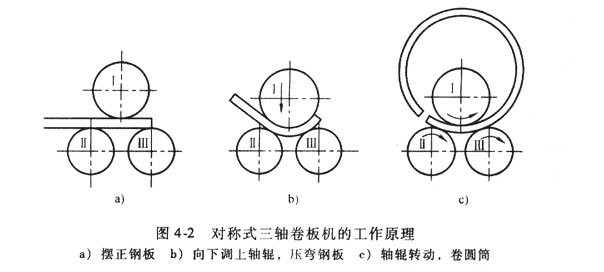 該機結(jié)構(gòu)型式為三輥對稱式,上輥在兩下輥中間對稱位置作垂直升降運動,通過絲桿絲母蝸桿傳動而獲得,兩下輥作旋轉(zhuǎn)運動,通過減速機的輸出齒輪與下輥齒輪嚙合,為卷制板材提供扭矩。